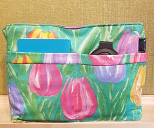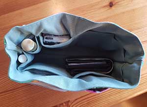 Väskindelaren är uppdelad i olika fack. Det finns långa fack för mascara och pennor och kortare för läppstiftet och busskortet.